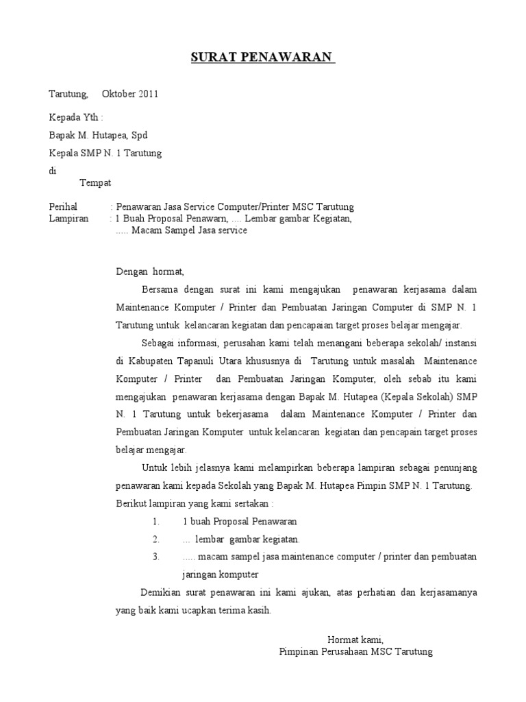 Penjelasan mengenai metode pembayaran yang dapat dilakukan. Contoh surat penawaran jasa service. Berawal dari sebuah printer, usaha kami berkembang menjadi usaha percetakan yang omzetnya lumayan. Kepentingan surat penawaran seperti ini dalam dunia bisnis adalah jalan pembuka untuk negosiasi harga. Posted at 16 25 2 comments 2 responses to surat penawaran service ac semarang unknown 12 februari 2017 19 30. 9 contoh surat penawaran untuk mempromosikan produk jasa anda. Siap melayani kebutuhan jasa kebersihan dengan pelayanan terbaik. 5 contoh surat penawaran bahasa indonesia dan inggris. Surat penawaran perusahaan instansi cetak kreatif. Dengan hormat, bersama surat ini saya bermaksud mengajukan surat penawaran jasa service komputer dan jaringan baik untuk perorangan, perusahaan, sekolah, kampus dan lain. Contoh surat penawaran dan cara membuat yang baik dan benar selamat datang di dosencoid web digital berbagi ilmu pengetahuan. Itulah yang dapat admin bagikan mengenai contoh proposal penawaran jasa service printer. Web terkait mengenai pinjaman ini: